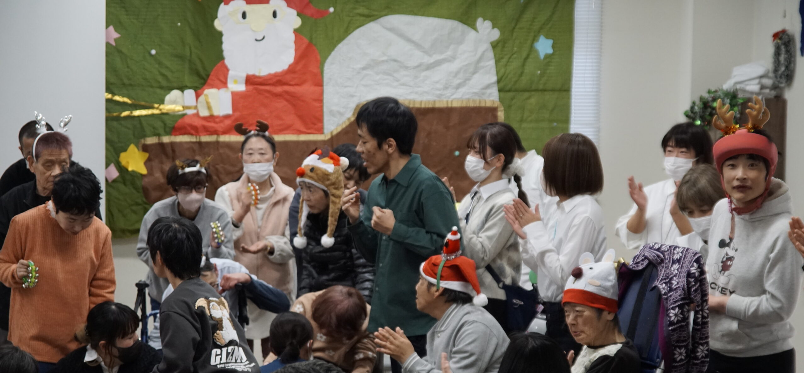 今年は、保護者の方と一緒に食事やボランティアによる演奏会などを楽しむことができました。また、一年を振り返るスライドショーでは、利用者の方々は自分の姿が映るたびに指をさして自分が写っていることを家族にアピールし、3人のサンタクロース(理事長、施設長、事務長)からのクリスマスプレゼントをもらい、最後にはクリスマスソングの大合唱で盛り上がりました。